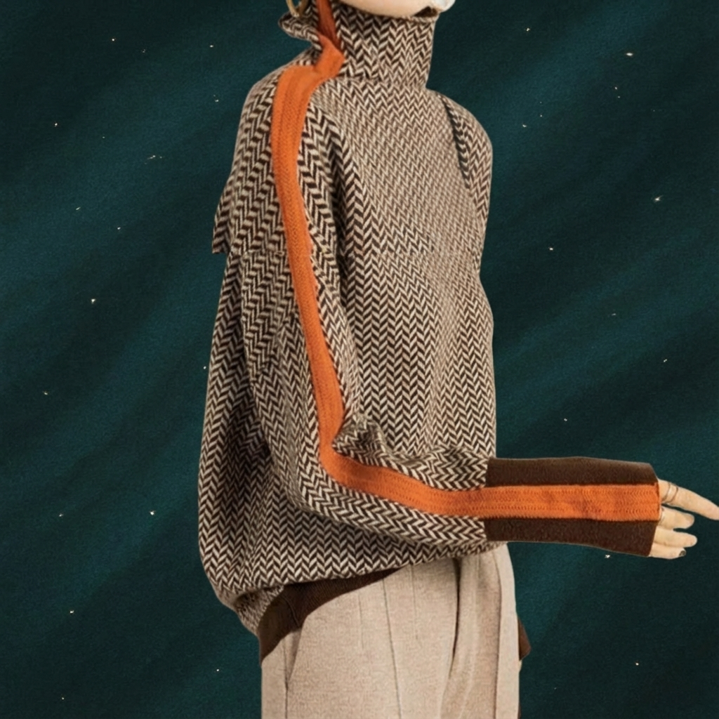 Despídete de los tejidos que pican y los jerséis sin forma. El jersey de cuello alto Sofia está confeccionado con un tejido de punto de primera calidad y tacto suave que resulta agradable, ligero y cómodo sobre la piel. El llamativo diseño en espiga con cálidos detalles en naranja aporta un toque de sofisticación moderna, mientras que su corte holgado y favorecedor lo convierte en una prenda versátil para llevar tanto de día como de noche.